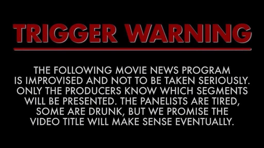 Trigger Warning/Cold open - Episodes of Flick Bait typically started with a short bit which aimed to present a ludicrous movie news story as fact, before immediately declaring it false. In later episodes, this bit was replaced by a facetious "trigger warning" that informed viewers the hosts were tired and/or drunk, and instructed viewers not to take the show seriously.