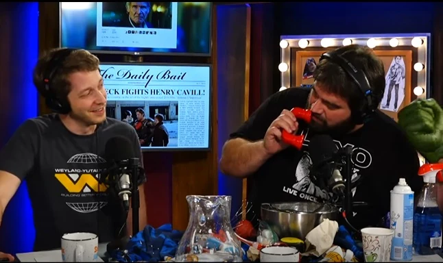 Nerdy ASMR – Andy's segment. Iron Man takes a shower. Andy whispers soothingly into the mike and pours water through a colander for effect. The Hulk calls mid-shower to join in. The others are extremely confused why Iron Man brought a colander into the shower in the first place, and question how exactly Hulk could participate in said shower from the other end of a phone.
